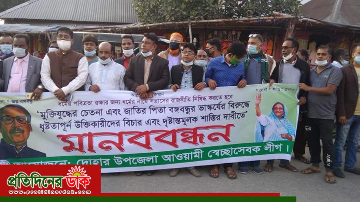 মানববন্ধনকালে দোহার উপজেলা স্বেচ্ছাসেবক লীগের সভাপতি বাশার চোকদার বলেন, ইসলাম শান্তির ধর্ম। আমরা সবাই শান্তি চাই। কিন্ত একটি বিশেষ মহল দেশের শান্তি নষ্ট করার জন্য জাতির পিতা বঙ্গবন্ধুর শেখ মুজিবুর রহমানের ভাস্কর্যের বিষয়ে বিভিন্ন ধরনের উস্কানিকমূলক কথা বলেছে, যা মোটেও কাম্য নয়। দেশে অশান্তির পরিবেশ সৃষ্টি করতে তারা ইসলামের নামে অপব্যাখা দিচ্ছেন। আমরা এ সব অপব্যাখ্যার তীব্র প্রতিবাদ জানাই এবং সেইসাথে জাতির পিতা বঙ্গবন্ধু শেখ মুজিবুর রহমানের ভাস্কর্যের বিরুদ্ধে ধৃষ্টতাপূর্ণ উক্তিকারীদের বিচার এবং দৃষ্টান্তমূলক শাস্তির দাবি করছি।