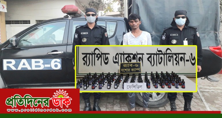 বোতল ভারতীয় ফেনসিডিল সহ তাকে হাতেনাতে আটক করা হয়। যশোর র্যাব-৬,সিপিসি ৩ ক্যাম্পের কোম্পানি কমান্ডার লেঃ এম সারোয়ার হুসাইন(এক্স)বিএন বলেন, বেনাপোল দিঘীরপাড় গ্রামের একটি মাঠের মধ্যে