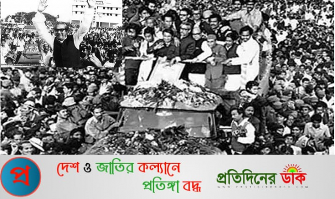 জনগণ নন্দিত শেখ মুজিব সোহরাওয়ার্দী উদ্যানে দাঁড়িয়ে তাঁর ঐতিহাসিক ধ্রুপদি বক্তৃতায় বলেন, ‘যে মাটিকে আমি এত ভালবাসি, যে মানুষকে আমি এত ভালবাসি, যে জাতিকে আমি এত ভালবাসি, আমি জানতাম না সে বাংলায় আমি যেতে পারবো কিনা। আজ আমি বাংলায় ফিরে এসেছি বাংলার ভাইয়েদের কাছে, মায়েদের কাছে, বোনদের কাছে। বাংলা আমার স্বাধীন, বাংলাদেশ আজ স্বাধীন।