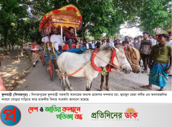 অনুষ্ঠান শেষে দেখা যায় এক ব্যতিক্রমী দৃশ্য কলেজের সকল বিভাগের উদ্যোগে অবসরে যাওয়া অধ্যক্ষ প্রফেসর খন্দকার মো. হুমায়ুন রেজা কবীরকে ঘোড়ার গাড়িতে করে বিদায় জানানো হয়। ফুলবাড়ী সরকারি কলেজ চত্বর থেকে প্রায় ১২ কিলোমিটার পথ অতিক্রম করে তাঁকে দিনাজপুরের বিরামপুর উপজেলার পূর্ব জগন্নাথপুর গ্রামে তার নিজ বাসভবনে পৌঁছে দেওয়া হয়। ফুলবাড়ীতে এ ধরনের আয়োজন এই প্রথম, যা উপস্থিত সকলের হৃদয়ে গভীর আবেগের সৃষ্টি করে।